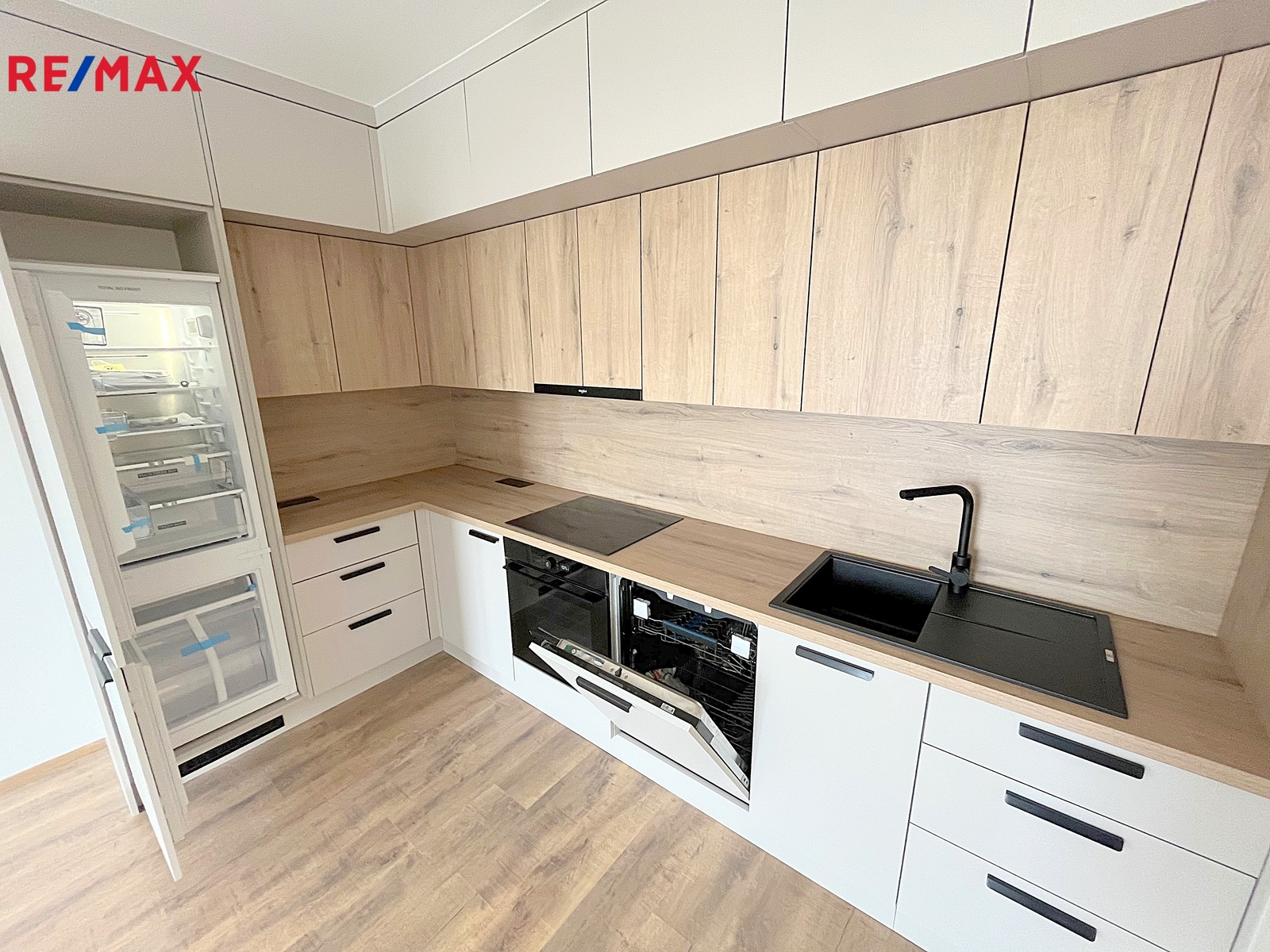 1x samostatný obývací pokoj (24m2) s novou kompletně spotřebiči vybavenou kuchyňskou linkou
