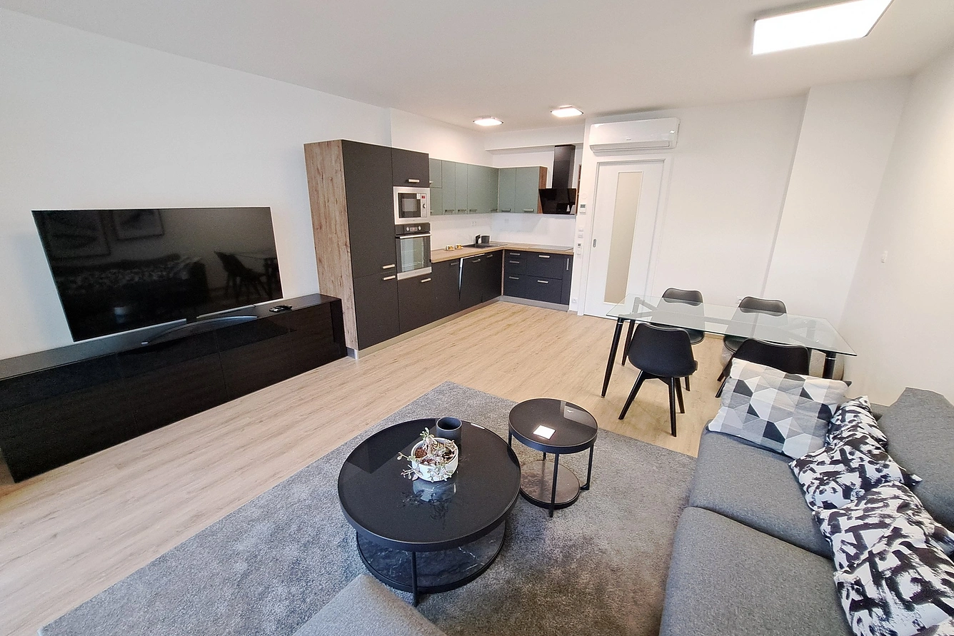 Se souhlasem majitele nabízíme k dlouhodobému pronájmu zařízený byt 3+kk o celkové ploše 92,1 m2 (vč. balkonu) se sklepem a garážovým stáním v novém developerském projektu, který najdete v těsném sousedství historického centra města Brna, u nákupního centra Galerie Vaňkovka a ÚAN Brno - Zvonařka.Moderní bydlení v centru, s výhledem na okolí, k nastěhování od 1.12.2025Vstupní hala, obývací pokoj s kuchyňským koutem (28,3 m2) s východem na balkon (10,4 m2), pokoj 1 (14,5 m2), pokoj 2 (12,7 m2), koupelna, samostatné WC, sklep, 1x garážové stání.Vstupní hala (skříně, osvětlení).Obývací pokoj (sedací pohovka, koberec, 2x konferenční stolek, TV stolek s televizí, jídelní stůl + 4x židle, klimatizace, osvětlení).Kuchyňská linka se spotřebiči (lednička s mrazákem, varná deska, digestoř, trouba, MV trouba, myčka, dřez, baterie).Pokoj 1 (skříně, skříňky, stůl s kontejnerem, pojízdný stolek, zrcadlo, koberec, klimatizace, světlo). Pokoj 2 (manželská postel, noční stolek, zrcadlo, skříň, klimatizace, osvětlení).Koupelna (vana, umyvadlo se skříňkou, zrcadlo, pračka, topný žebřík, světla).WC (závěsné WC, zrcadlo, umývátko se skříňkou, osvětlení).Náklady na bydlení cca 7.500,- Kč/měsíc (vyúčtovatelné dle skutečné spotřeby) + internet a TV .Majitel požaduje vratnou jistotu ve výši 60.000 Kč.
