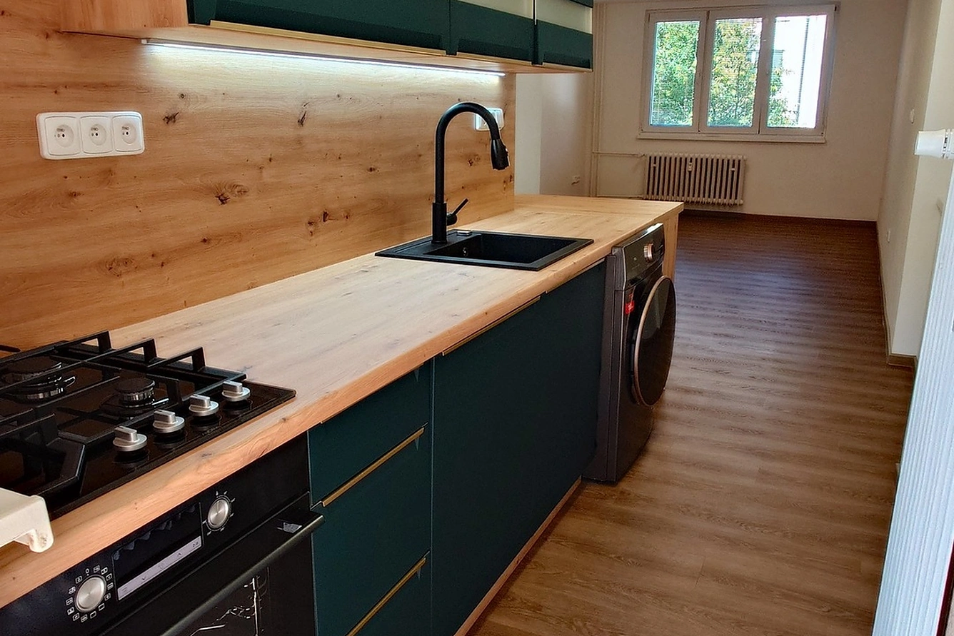 Pronájem zcela nově zrekonstruovaného bytu o velikosti 3+kk s balkonem. Byt se nachází se v prvním patře nižšího bytového domu s výtahem. Výměra bytu je 65m2. Byt je vybavený moderní kuchyňskou linkou s kompletními spotřebiči (plynová varná deska, trouba, myčka nádobí, pračka se sušičkou a lednice s mrazákem). Na podlahách jsou příjemné dřevěné podlahy a dlažby. V koupelně je prostorný sprchový kout, umyvadlo a WC. Na východní straně bytu je prostorný balkon s výhledem do parku. Orientace oken bytu je východ, západ a sever. Velmi pěkné a klidné místo obklopené zelení a parkem. Všechny energie jsou měřené a účtované podle skutečné spotřeby. Připojení k internetu je v ceně nájmu. Zastávka MHD ve vzdálenosti cca 100m. Parkování je možné v okolí domu. --- Nájemné: 18.000,- Kč/měs. --- Zálohy na energie: 4.800,- Kč/měs. --- Kauce: 36.000,- Kč.