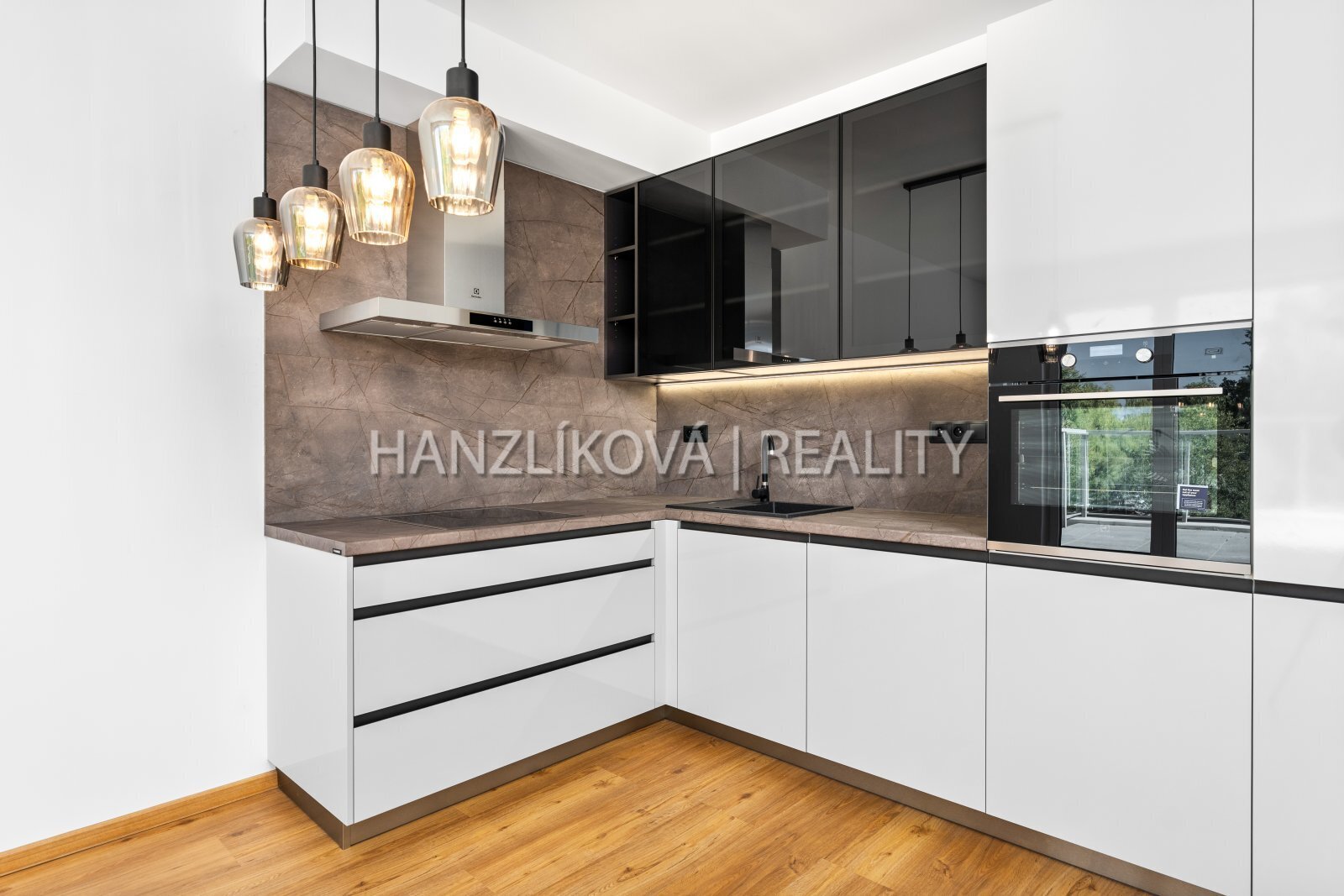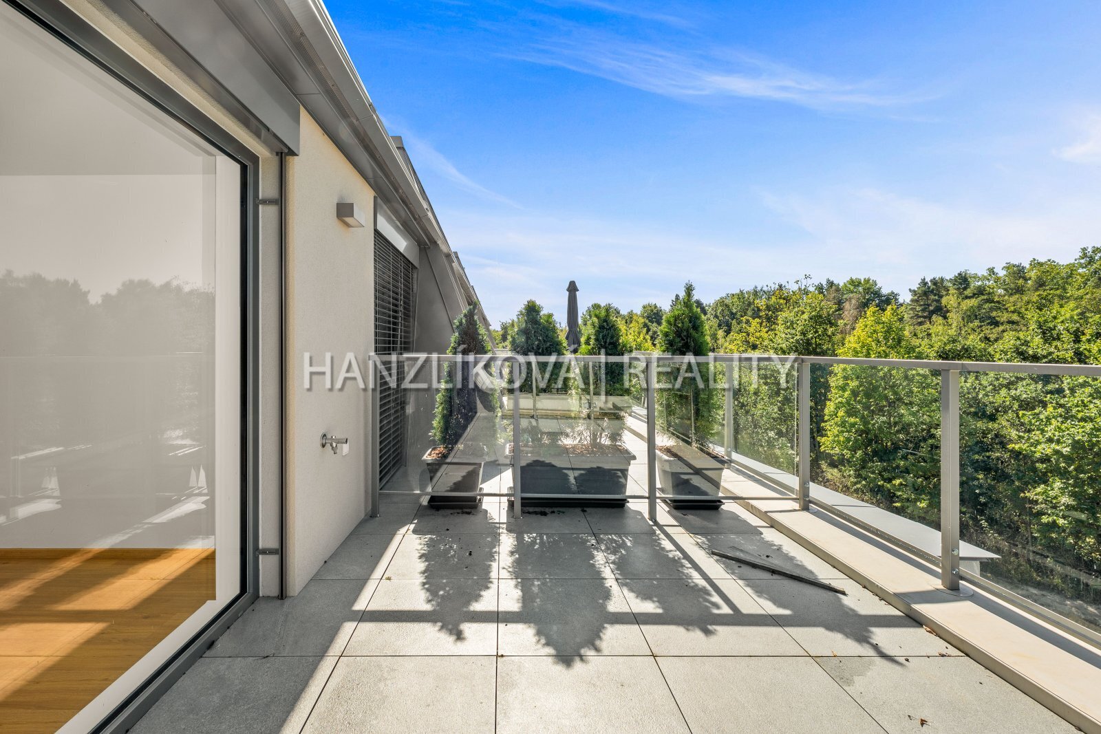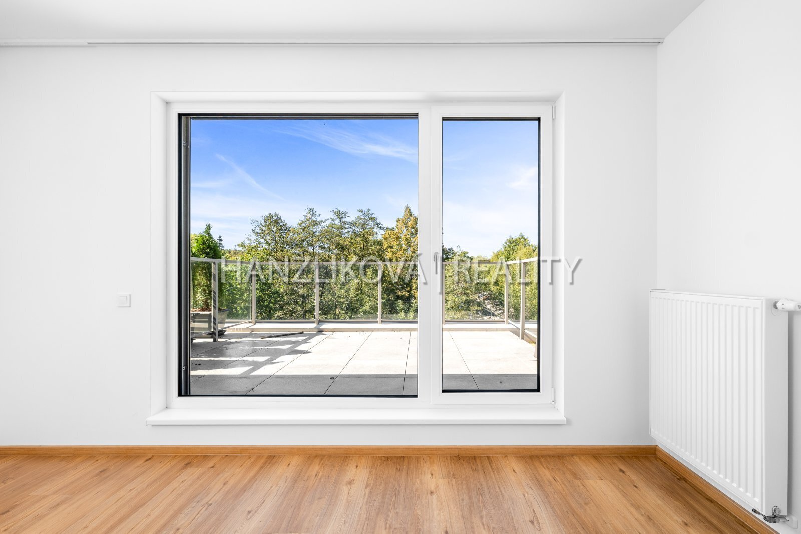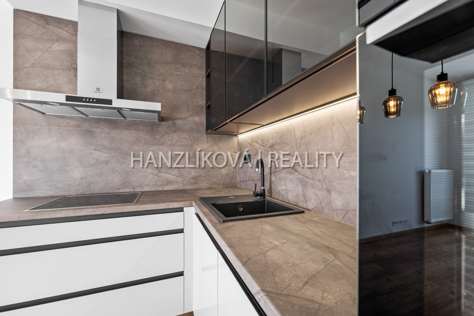 Byt je částečně vybaven – kuchyňská linka na míru od kuchyňského studia Hanák včetně značkových elektrospotřebičů, barový pult, osvětlení ve všech místnostech, klimatizační jednotky, předsíňová stěna, předokenní venkovní žaluzie.