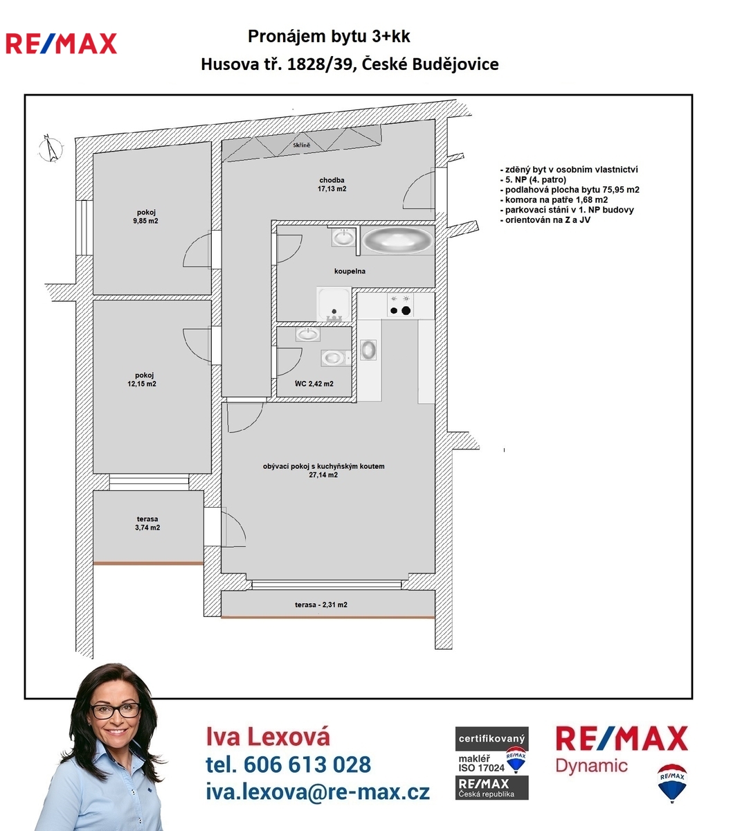Jihozápadně orientovaný byt v 5. NP je dispozičně řešený jako 3+kk s celkovou plochou 83,68 m2 (podlahová plocha bytu 76 m2, komora na patře 1,68 m2, terasa 3,74 m2 a balkon (francouzské okno 2,31 m2). Součástí je parkovací stání v 1.NP budovy.