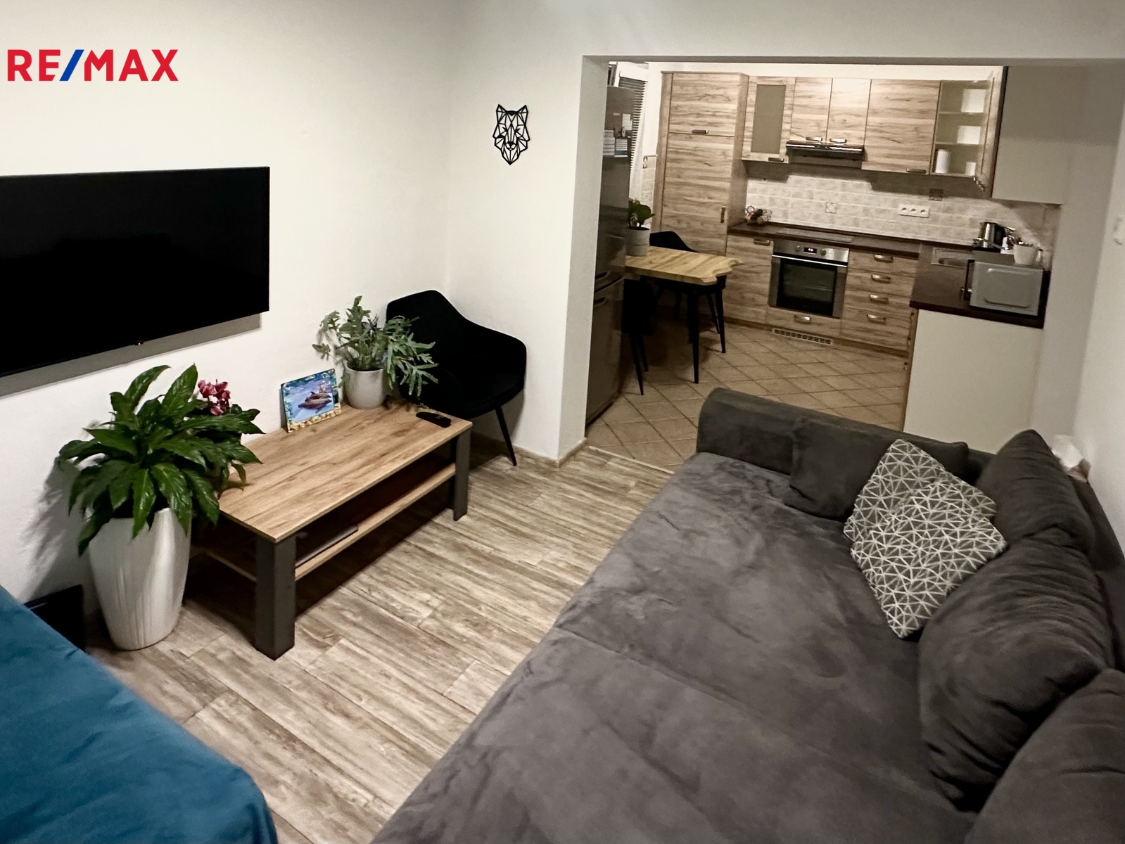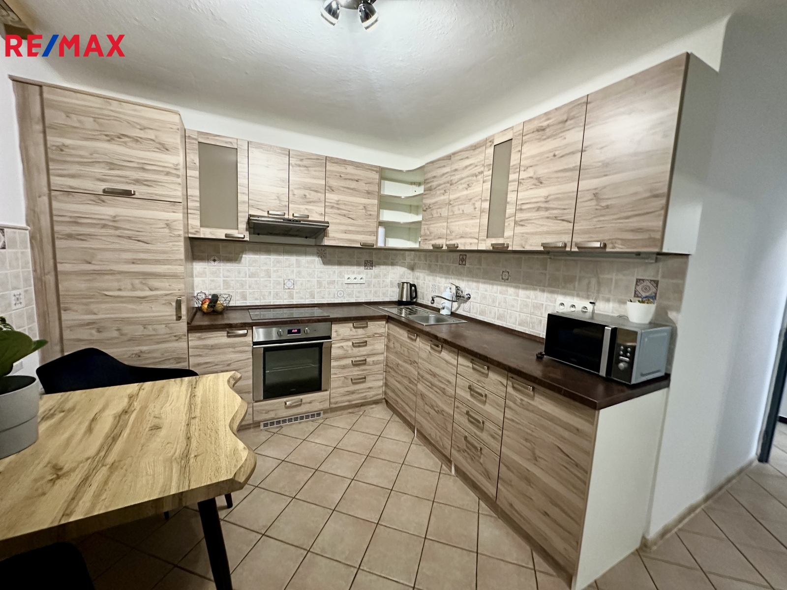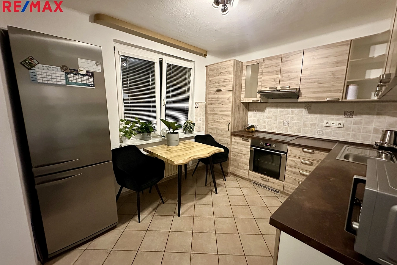 Byt se skládá z předsíně, ložnice s vestavěnou skříní, dalšího samostatného pokoje a obývacího pokoje s kuchyňským koutem, kde zůstává kuchyňská linka vybavená sporákem, indukční varnou deskou, digestoří a myčkou. Součástí vybavení je i lednička s mrazákem. Koupelna a toaleta jsou oddělené, a na chodbě je k dispozici další vestavěná skříň, která poskytuje spoustu úložného prostoru. Nový zájemce o pronájem vstupuje do částečně vybaveného bytu, kde zůstává základní vybavení a je možnost odkoupit pračku od stávajícího nájemce.