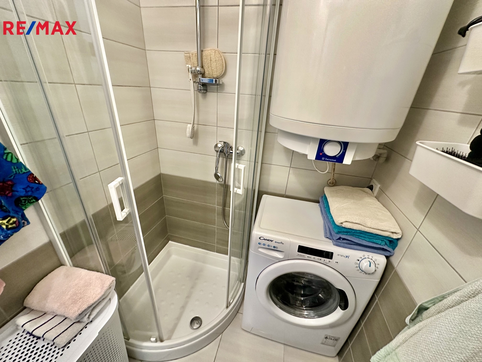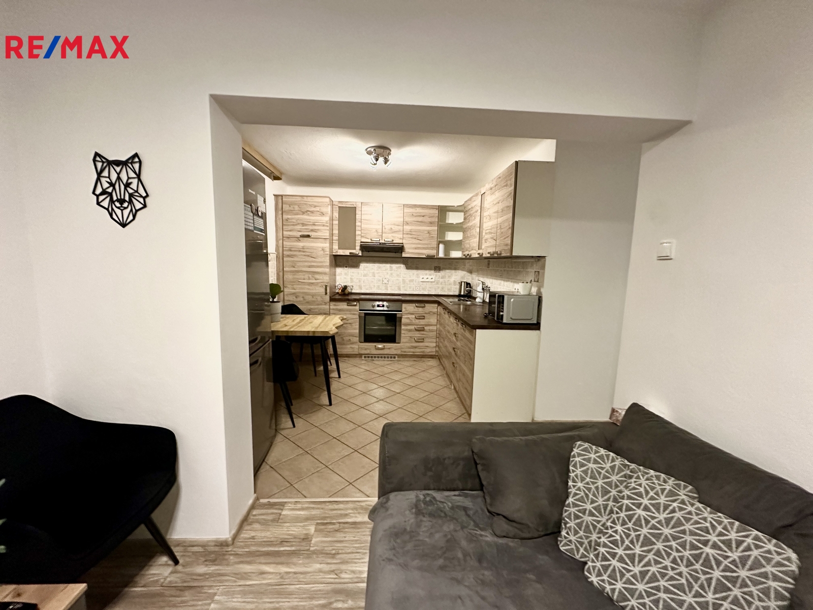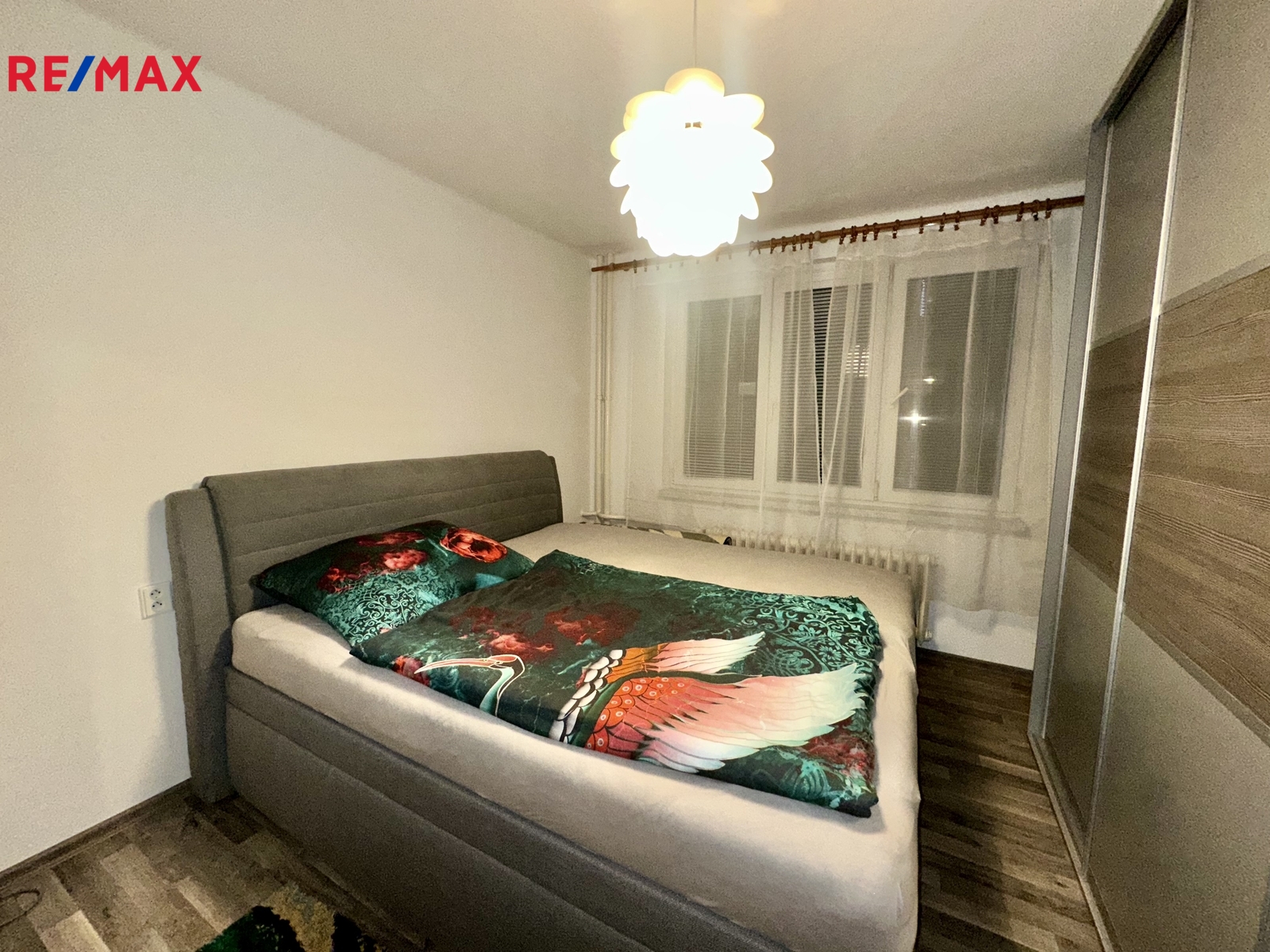 Byt se skládá z předsíně, ložnice s vestavěnou skříní, dalšího samostatného pokoje a obývacího pokoje s kuchyňským koutem, kde zůstává kuchyňská linka vybavená sporákem, indukční varnou deskou, digestoří a myčkou. Součástí vybavení je i lednička s mrazákem. Koupelna a toaleta jsou oddělené, a na chodbě je k dispozici další vestavěná skříň, která poskytuje spoustu úložného prostoru. Nový zájemce o pronájem vstupuje do částečně vybaveného bytu, kde zůstává základní vybavení a je možnost odkoupit pračku od stávajícího nájemce.