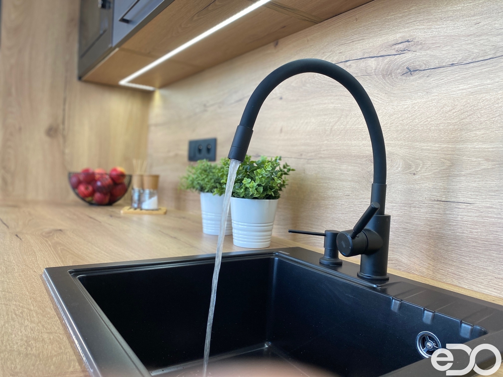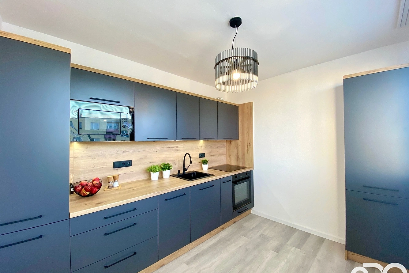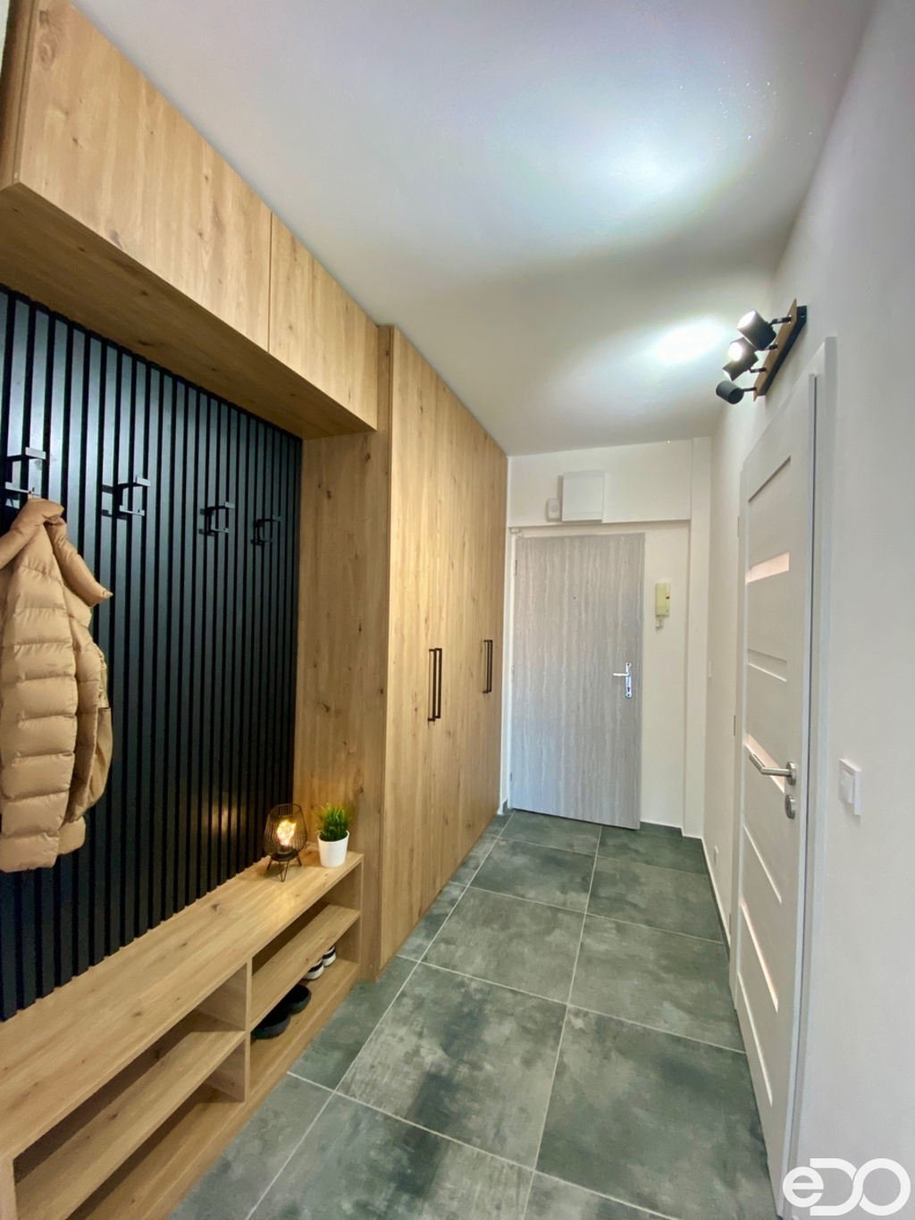 Součástí bytu je nová, moderní kuchyňská linka včetně všech spotřebičů – lednička s mrazákem, myčka nádobí, mikrovlnná trouba, sklokeramická varná deska a elektrická trouba. V chodbě se nachází praktické vestavěné skříně na míru, které poskytují dostatek úložných prostor. V ložnici je navíc velká šatní skříň.
