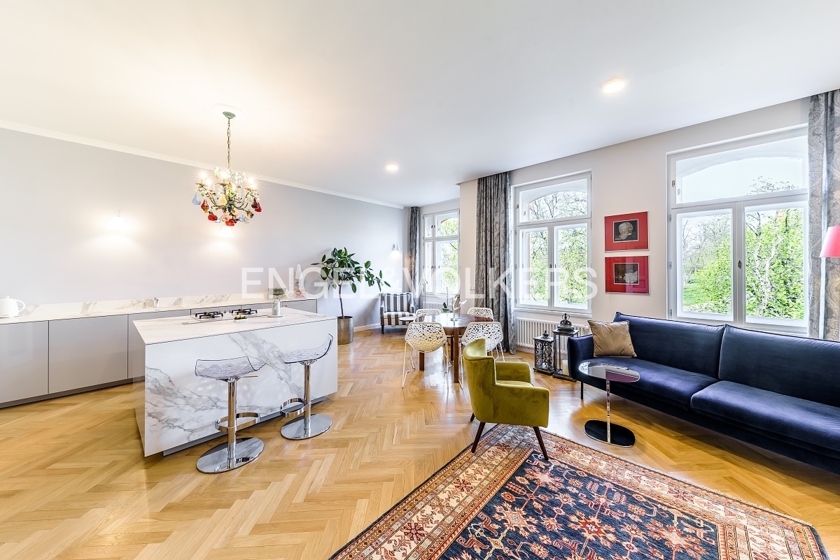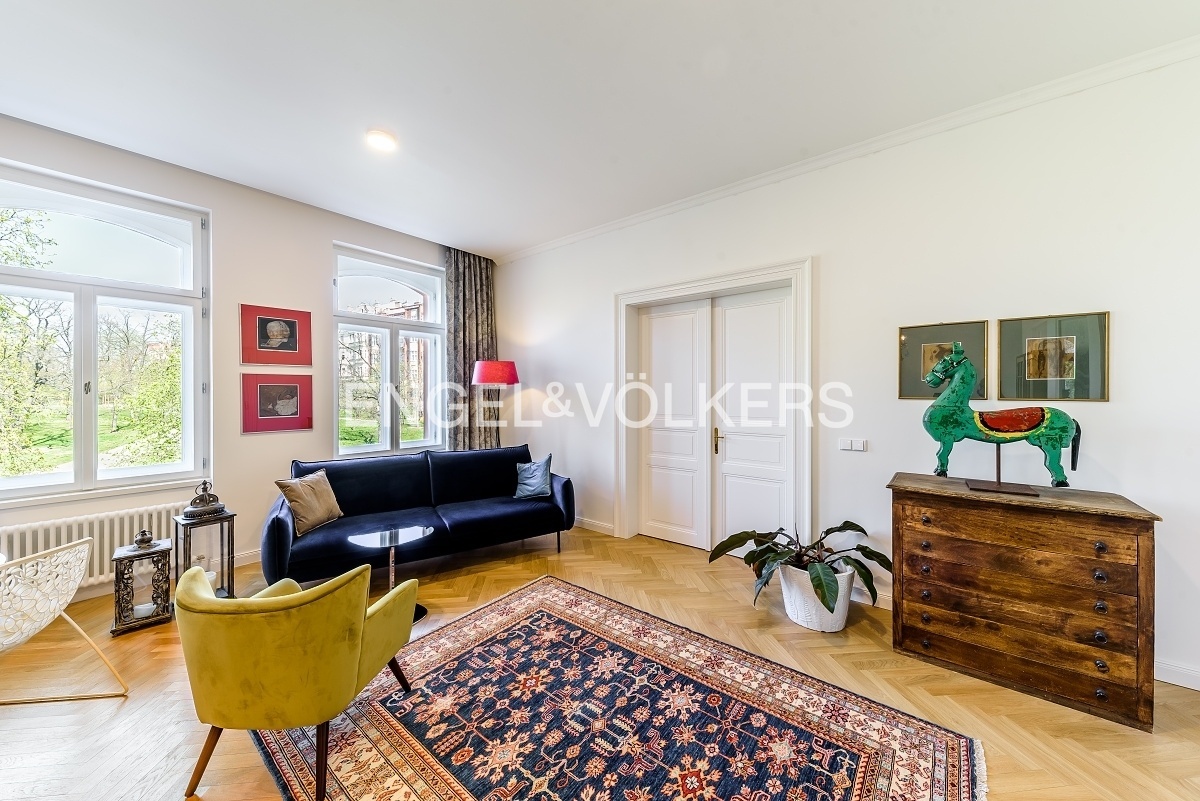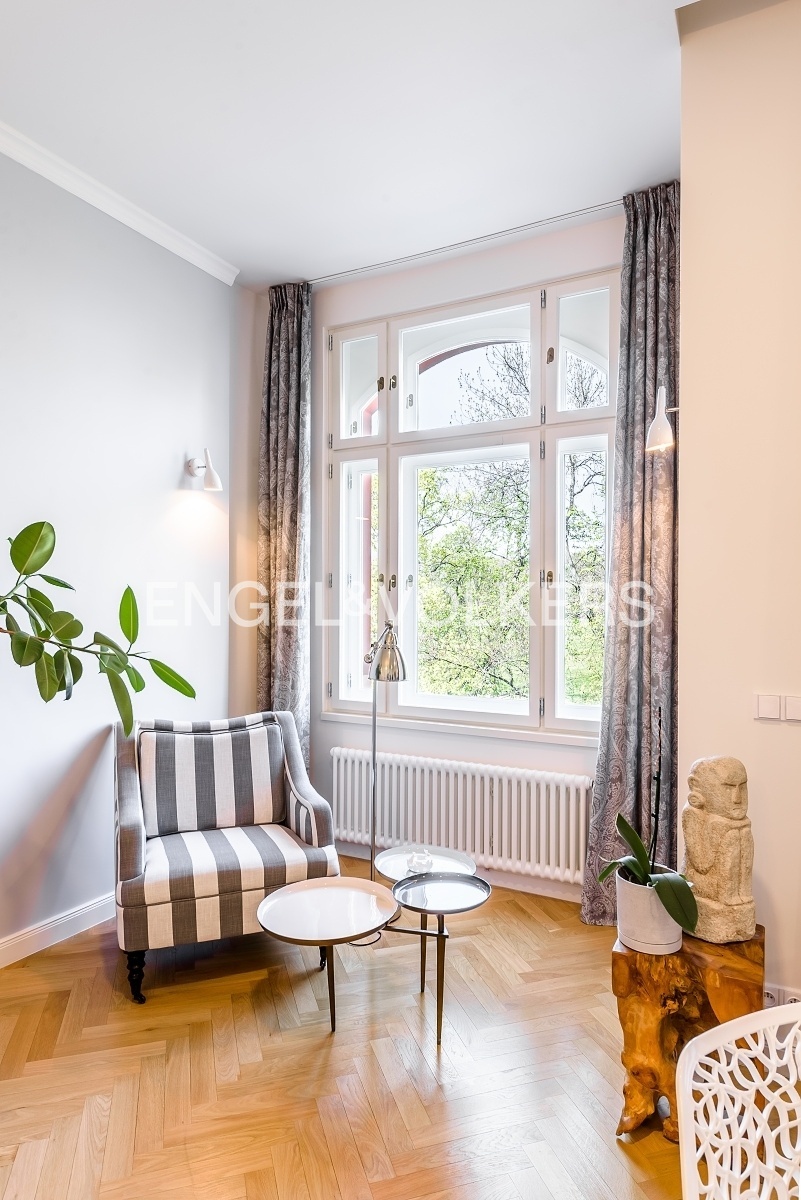 V jedné z nejoblíbenějších rezidenčních lokalit v Praze je nyní nabízen nákladně zrekonstruovaný velkoryse řešený byt s dispozici 3+kk plně vybavený luxusním nábytkem. Lokace historického činžovního domu umožňuje uklidňující výhledy do sluncem zalitých Riegerových sadů.Byt je prošpikovaný luxusními materiály od dubových parket, přes ořechové obklady, mramorem obloženého krbu až po velkoformátové desky přírodního kamene, to vše osvětlují ručně dělaná svítidla.Privátní část bytu je orientována do vnitrobloku; tvoří ji prostorná ložnice s francouzským oknem, vlastní šatnou a en-suite koupelnou s volně stojící vanou i luxusním sprchovým koutem.Dispozičně se byt skládá s prostorné předsíně s vestavěnými skříněmi, velkorysého obývacího pokoje s luxusní kuchyní plně vybavenou spotřebiči Smeg, relaxační místnosti s plynovým krbem, kterou je možné využívat také jako pokoj pro hosty, technické místnosti s pračkou i sušičkou a hostovské koupelny s toaletou a sprchovým koutem. K bytu je možné si pořídit 1-2 parkovací stání v areálu blízkého Sokola za příplatek.