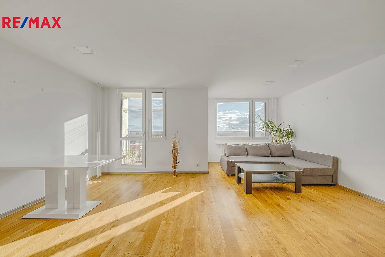 Nabízíme k pronájmu prostorný a světlý byt o dispozici 3+kk a podlahové ploše 72 m², který se nachází v 9. patře panelového domu s krásným jižním výhledem na Milíčovský les.
