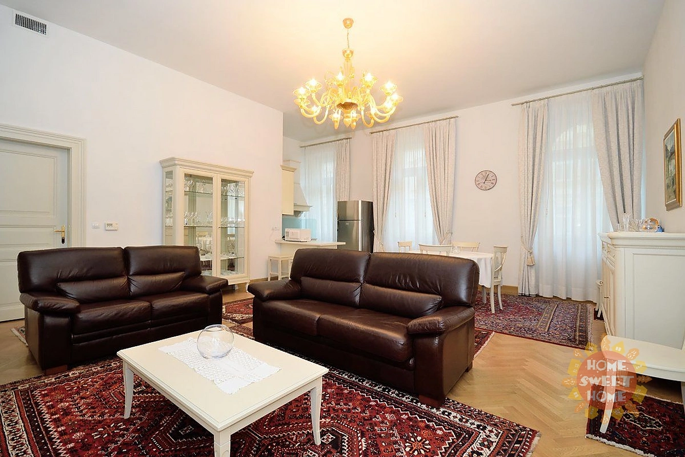 Nabízíme k pronájmu luxusní klimatizovaný apartmán 3+kk v prestižní zóně pražských Vinohrad, jen 50m od nádherného parku s kostelem sv. Ludmily. Apartman o celkové rozloze 96m2 je koncipovan tak, aby uspokojil nejnáročnější z náročných a nabízí prostorný obývací pokoj s plně vybaveným kuchyňským koutem (troubou, lednicí, mrazákem, myčkou nádobí, mikrovlnnou troubou, sklokeramickou deskou, digestoří), 2 ložnice a koupelnu s umyvadlem, vanou a toaletou. Možnost pronájmu garážové stání za příplatek 5000 CZK + DPH. Obyvatelům je k dispozici 24/7 recepce, vrátnice a kamerový systém a odpočinková zóna vyhřívaný venkovní bazén s vodní masáží a saunou a udržovaná kráaná zahrada. Výborné spojení s centrem - metro trasa A, autobusová zastávka přímo před domem. Václavské náměstí je pouhých 5 minut chůze.