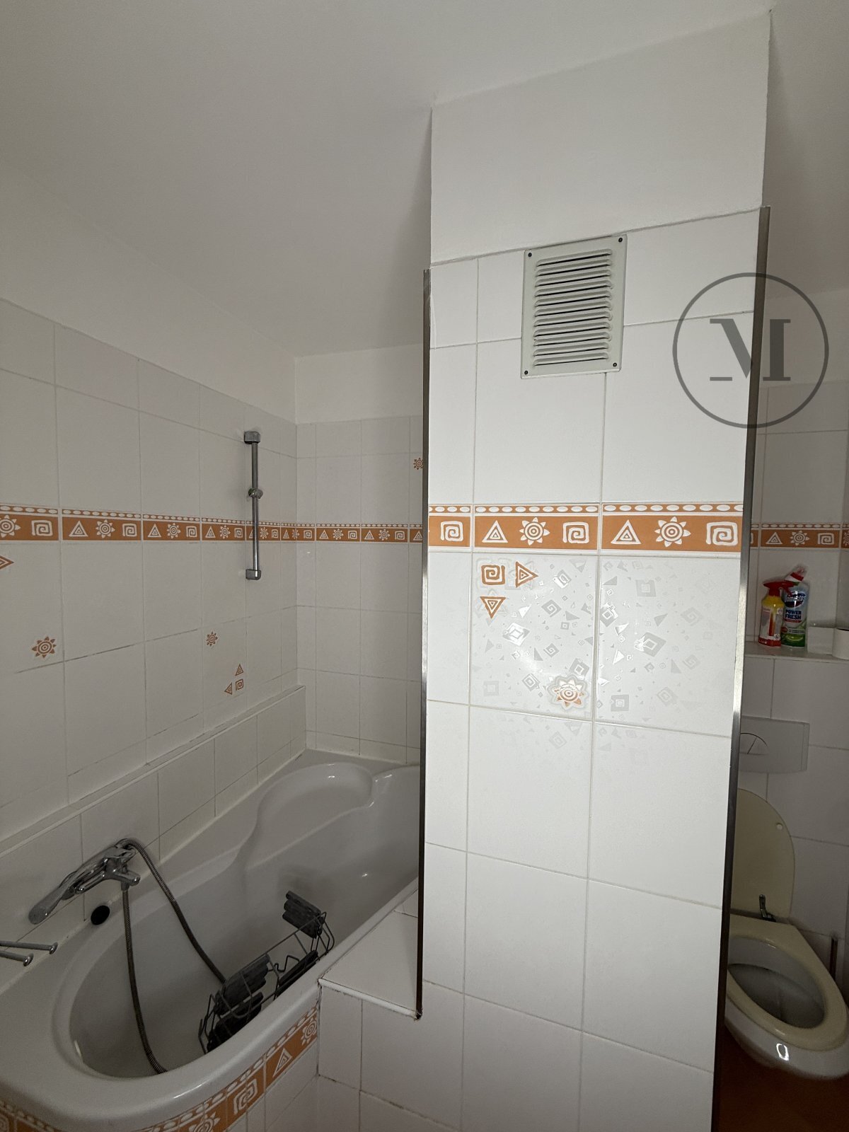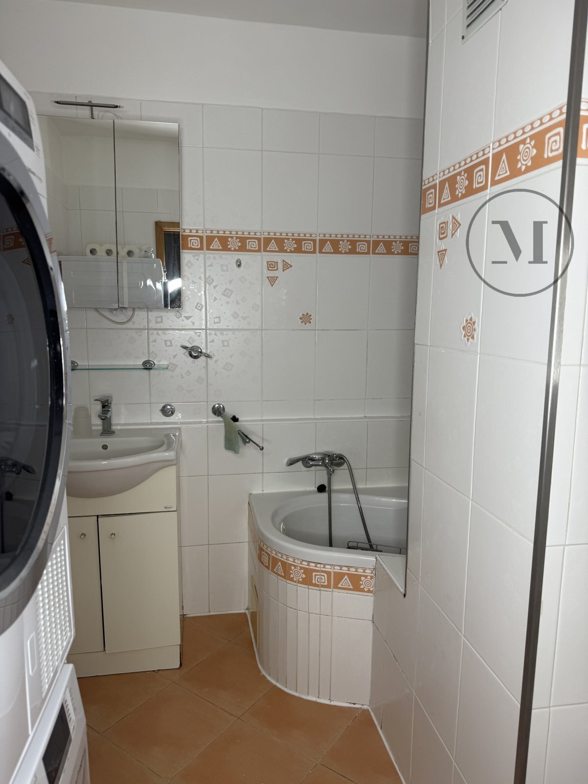 Koupelna je v původním stavu s vanou – plně funkční, ale barevně výrazná (oranžová). Součástí vybavení je pračka a sušička.