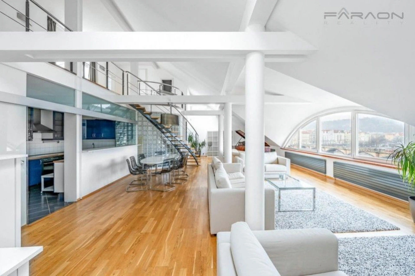 K pronájmu luxusní dvoupatrový byt 5+kk, 250 m2 s terasou a zimní zahradou, s nádherným výhledem na řeku Vltavu, Pražský Hrad a Petřín, v 6. a 7. patře kompletně zrekonstruované historické secesní budovy s výtahem v blízkosti nábřeží, pár minut od Palackého náměstí a Karlova náměstí, v ulici Dřevná, Nové Město, Praha 2.