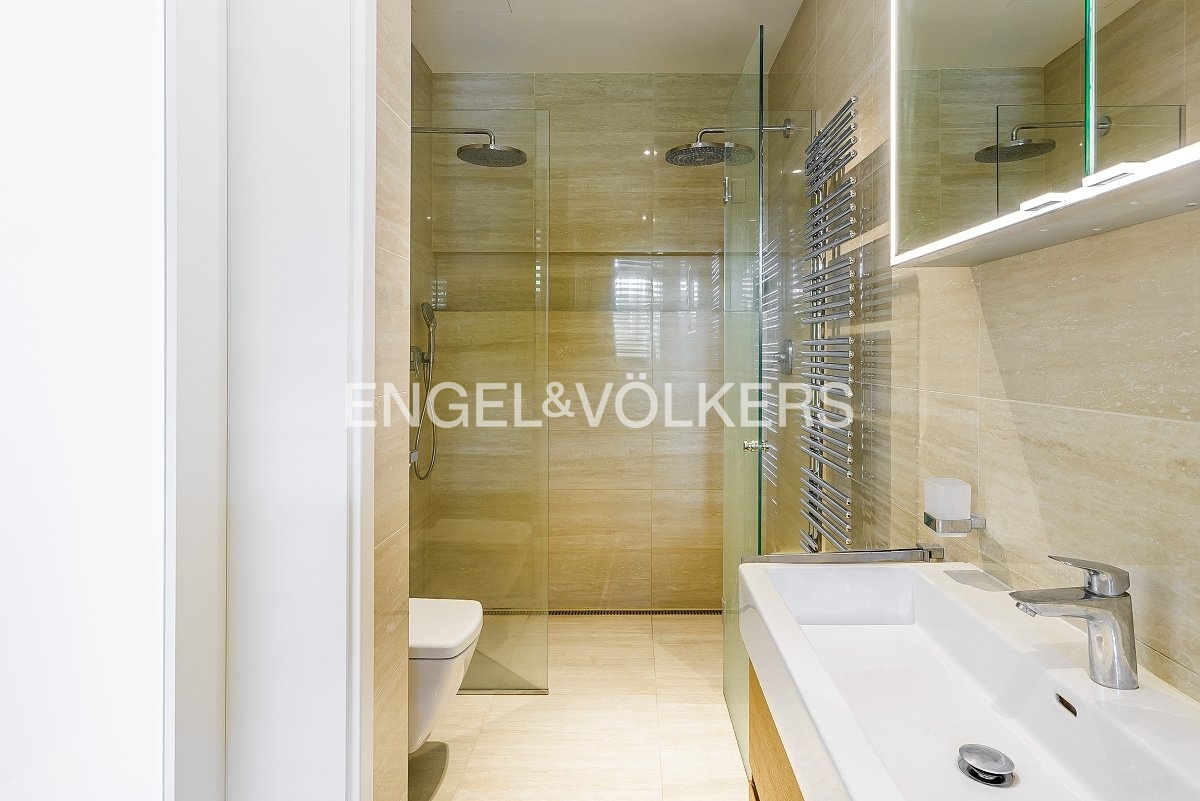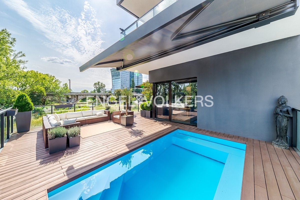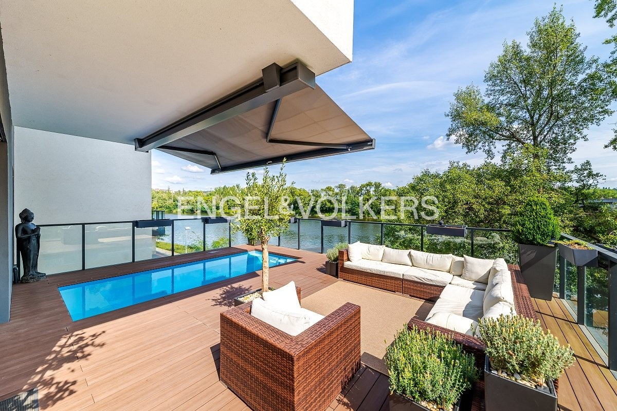 Nabízíme k pronájmu exkluzivní dvoupodlažní byt ve stylu townhouse v rezidenci Marina Island s výhledem na Vltavu. Byt s dispozicí 6+kk nabízí prostornou terasu (79 m2) s vyhřívaným bazénem se slanou vodou, venkovním sezením, grilem a maximálním soukromím. Nachází se v novém rezidenčním projektu s recepcí a fitness v srdci holešovického poloostrova.V prvním patře je světlá obývací místnost s krbem, kuchyní na míru se spotřebiči Miele a jídelnou propojenou s terasou. Hlavní ložnice má vlastní koupelnu a přístup na terasu. Další 3 ložnice (jedna jako pracovna) mají společnou koupelnu a přístup na předzahrádku. K dispozici je vstupní hala s úložnými prostory a toaleta.Ve spodním patře se nachází společenská a TV místnost s vinotékou, prádelna s pračkou a sušičkou Miele a vstup do soukromé garáže pro 2 vozy.Možnost krátkodobého pronájmu na 3 až 6 měsíců. Možnost pronájmu nábytku.Zájemce je srozuměn s provizí realitní kanceláři jednoho měsíčního nájmu + DPH.