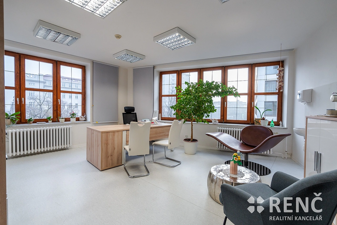 Nabízíme k pronájmu prostorný soubor - 4 místnosti se zázemím, který je umístěný ve 4. nadzemním podlaží cihlového polyfunkčního domu s výtahem v žádané lokalitě Brna nedaleko centra města na ulici Slovákova. Celková podlahová plocha je 128,9 m2 – výměra jednotlivých místností 20,4 + 25,7 + 24,8 + 15,4 m2, vstupní hala 15,2 m2, kuchyňka 11,4 m2, 2x WC, sklad 3,3 m2, chodba 7,2 m2. Všechny místnosti mají samostatné vstupy z haly, jen sklad je přístupný z kuchyňky.V prostorách je instalována klimatizace, nejsou vybaveny nábytkem. V současné době je prostor využíván jako ordinace lékařů, ale je vhodný i pro administrativní činnost.V nebytovém prostoru je zaveden vysokorychlostní internet (Vodafone), který není zahrnut v měsíční zálohové ceně služeb. Vytápění a ohřev vody zajišťuje kotelna v domě.V domě je k dispozici recepce, objekt je přístupný 24 hodin.Dům je situován v nedaleko centra města v blízkosti Moravského náměstí s veškerou občanskou vybaveností v dosahu.Prostor je volný od 2. února 2026 a je zde možnost dlouhodobého nájmu. Kauce ve výši 147.500 Kč. Cena: 49.627,-Kč/měs. + služby 13.713,-Kč/měs. Nájemce nehradí provizi realitní kanceláři.
