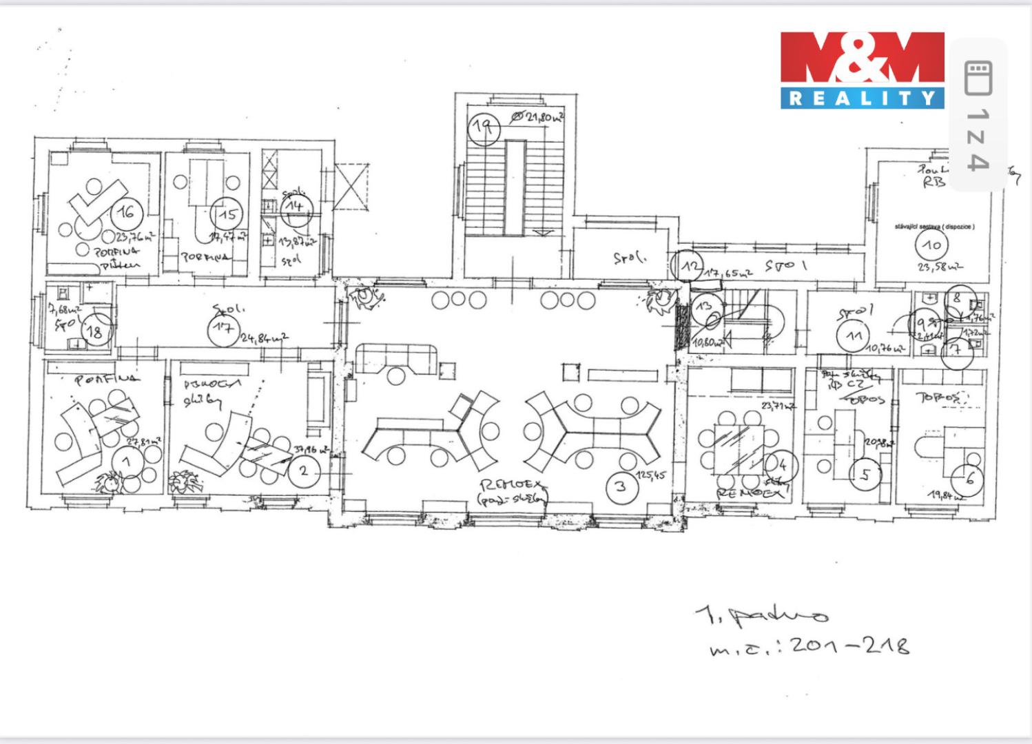 Dispozice nabízí několik pracovišť s dostatkem denního světla díky vysokým oknům. Interiér kombinuje historický charakter s moderními prvky, což vytváří příjemné pracovní prostředí. Součástí pronájmu je zasedací místnost, která je vybavená projektorem.