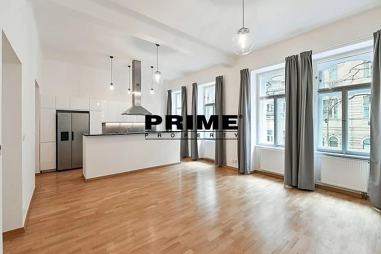 Zrekonstruovaný, 2 ložnicový, nezařízený mezonetový byt se 2 koupelnami k pronájmu, vhodný také ke klidnému kancelářskému provozu, 3+kk, 118m2, s malým balkonem a s možností pronájmu garáže, situovaný v 1. patře a přízemí zrekonstruovaného secesního bytového domu s výtahem (dvě místnosti směřují do klidného vnitrobloku).