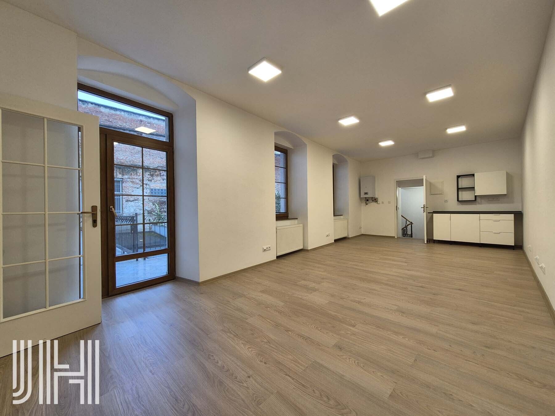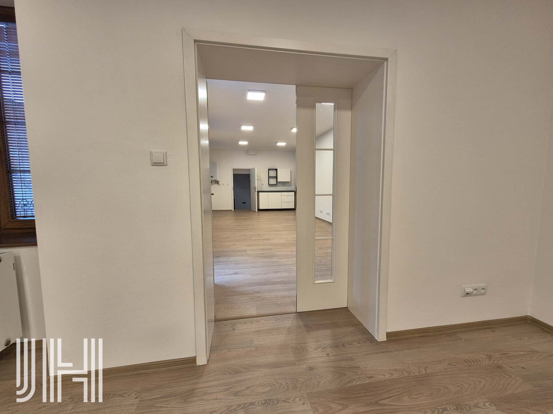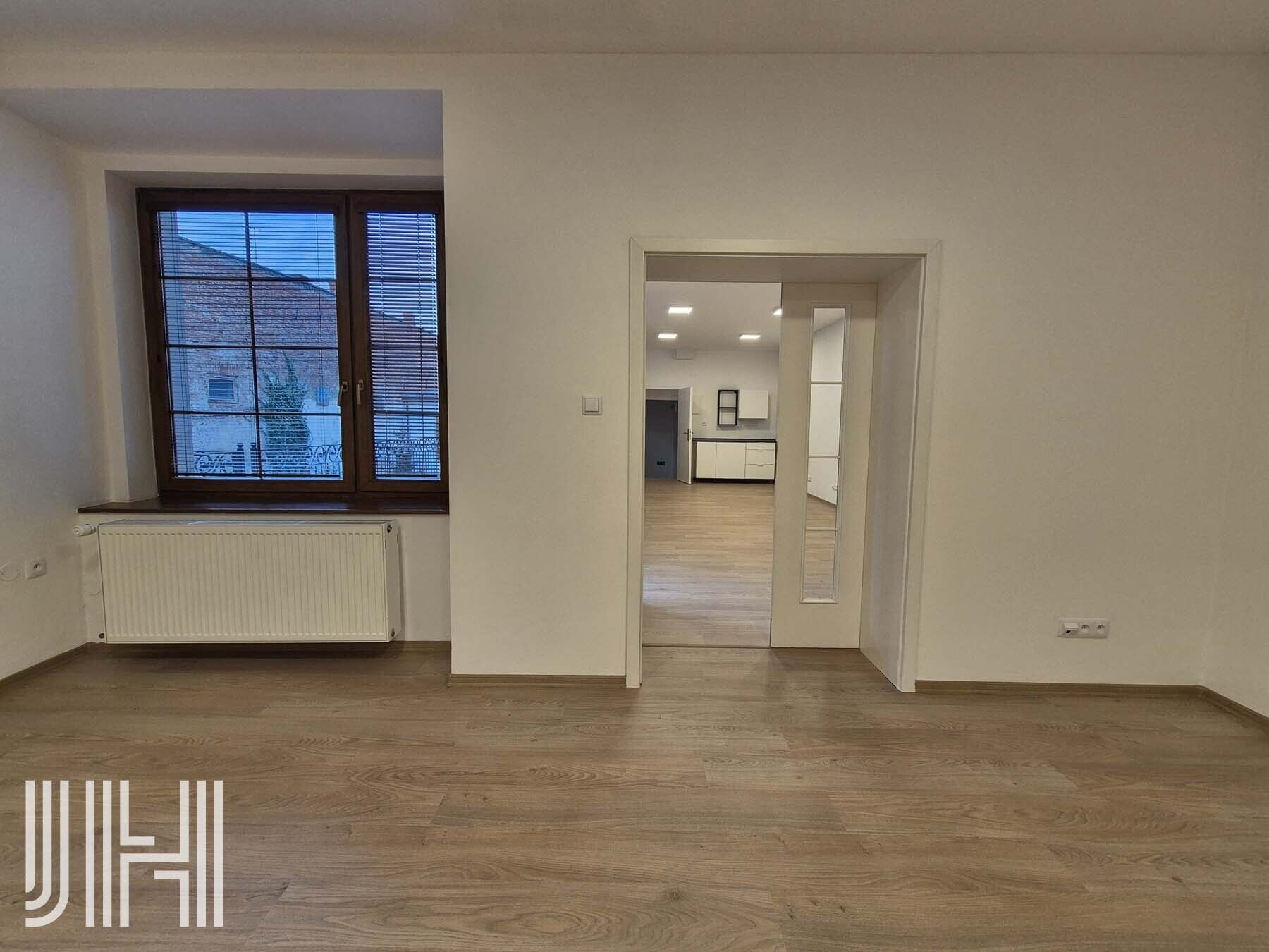 Nabízíme k pronájmu dvě nově opravené kanceláře o výměře 70 m2 nacházející se v 1. patře dvorního traktu bytového domu v centru města na náměstí. Kanceláře mají vstup ze schodiště domu, dvě místnosti o rozměrech 8,5 x 4,5 m a 5,8 x 5,5 m s kuchyňskou linkou, sociální zařízení v přízemí domu, K dispozici terasa se vstupem z kanceláře. Kancelář orientovaná na jižní stranu. Vlastní vytápění elektrokotlem, el. bojler, laminátové podlahy, osvětlení. Možnost pronájmu parkovacího místa na dvoře domu (1.000 Kč/měs.). Dům je průchozí, vstup možný z Žižkova nám. i Knihařské ul. Volné ihned. Záloha na energie cca 3.000 Kč. PENB – G.
