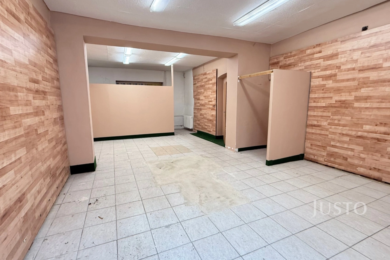 Interiér nabízí dostatek denního světla díky velkým výlohám orientovaným do ulice, které zároveň umožňují prezentaci vaší firmy nebo služeb. Podlaha je pokryta dlažbou, stěny jsou částečně opatřeny dekorem dřeva, což prostoru dodává modernější vzhled. Vstup do kanceláře je přímo z ulice, což zajišťuje pohodlný přístup pro klienty i zaměstnance.