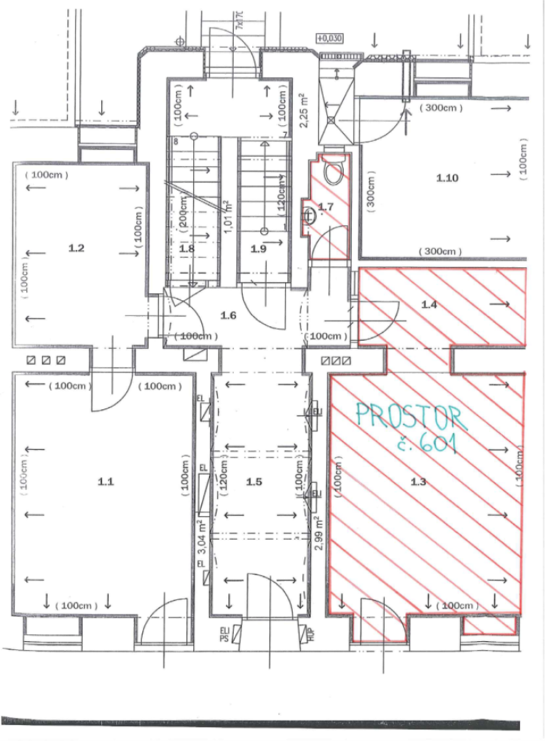 Nebytový prostor má celkovou plochu 26 m² a sestává z prodejní místnosti o výměře 20,3 m² a zázemí o výměře 5,7 m², viz půdorys. Spolu s nebytovým prostorem č. 601 bude nájemce užívat společné WC o výměře 1,9 m² nacházející se v přízemí výše uvedené budovy, které je přístupné přes společné prostory budovy a je společné s nájemcem sousedního nebytového prostoru. V prostoru proběhne do 30.01.2026 výměna dveří včetně zárubní služebního vchodu umístěného ve společné chodbě domu za protipožární dveře.