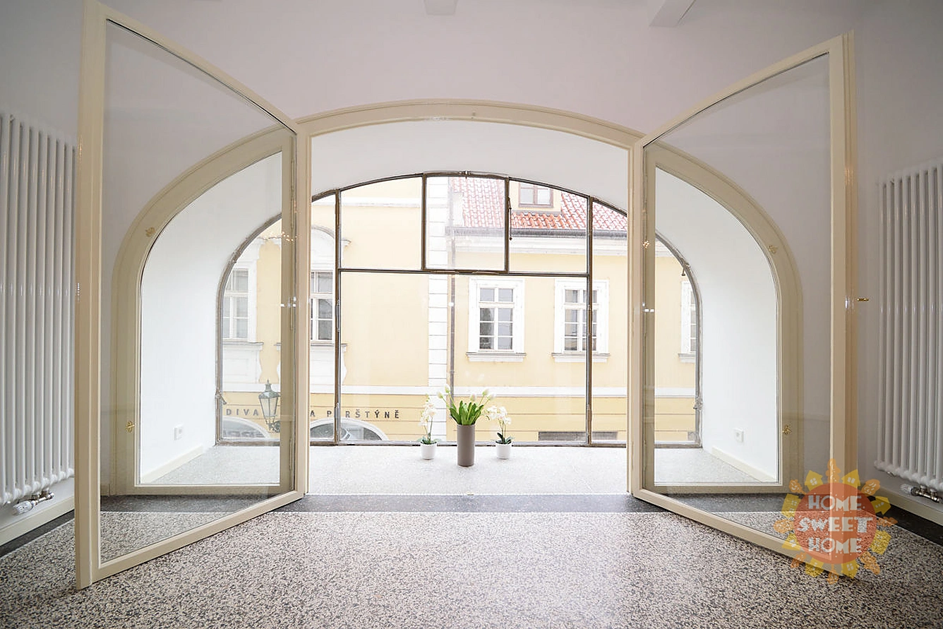 Světlý prostor v centru Prahy se skládá ze dvou samostatných místností ( větší místnost má zimní zahradu), haly s kuchyňskou linkou plně vybavenou (sklokeramická deska, elektrická trouba, myčka, lednice s mrazákem, digestoř), koupelna se sprchovým koutem a toaleta je samostatně, K dispozici je alarm, samostatné plynové topení a podlahy tvoří mramor.