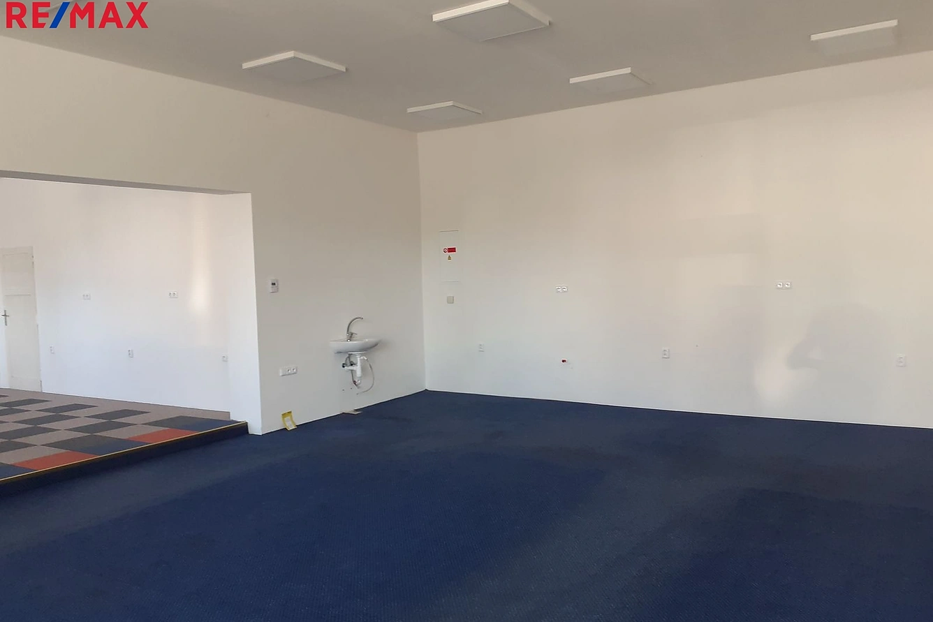 2. - Prostor přístupný samostatným vchodem z boku budovy. Ze zádveří vstupujeme do šatny, dále do chodbičky, odkud je vstup do centrální místnosti o velikosti 23 m2 a sociálního zařízení. (Celková užitná plocha 42 m2).