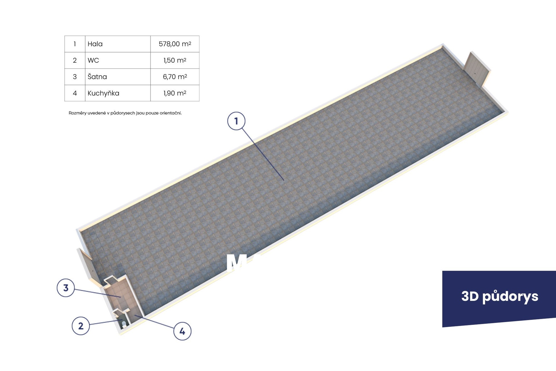 Nabízíme k pronájmu skladovací halu o rozměrech 49 × 12 metrů, tedy o celkové ploše 588 m2.Prostor je ideální pro skladování, lehkou výrobu, e-shop logistiku nebo jako zázemí firmy.Hala je světlá a vzdušná díky řadě oken po celé délce objektu.K dispozici jsou dvoje vjezdové vrata:- z jedné strany vrata s rampou,- z druhé strany přímý vjezd dovnitř haly.Manipulace s nákladem je snadná, příjezd pro dodávky i menší kamiony je bezproblémový, parkování možné přímo u objektu.Nájemné a podmínky:- Cena nájmu: 150 Kč/m2/měsíc,- Celkové měsíční nájemné: 88 200 Kč/měsíc,- Provize: 88 200 Kč,- Dostupnost: ihned.Hala je ideální pro firmy hledající velkorysý, suchý a snadno přístupný skladovací prostor s možností pohodlné manipulace a vjezdu techniky.