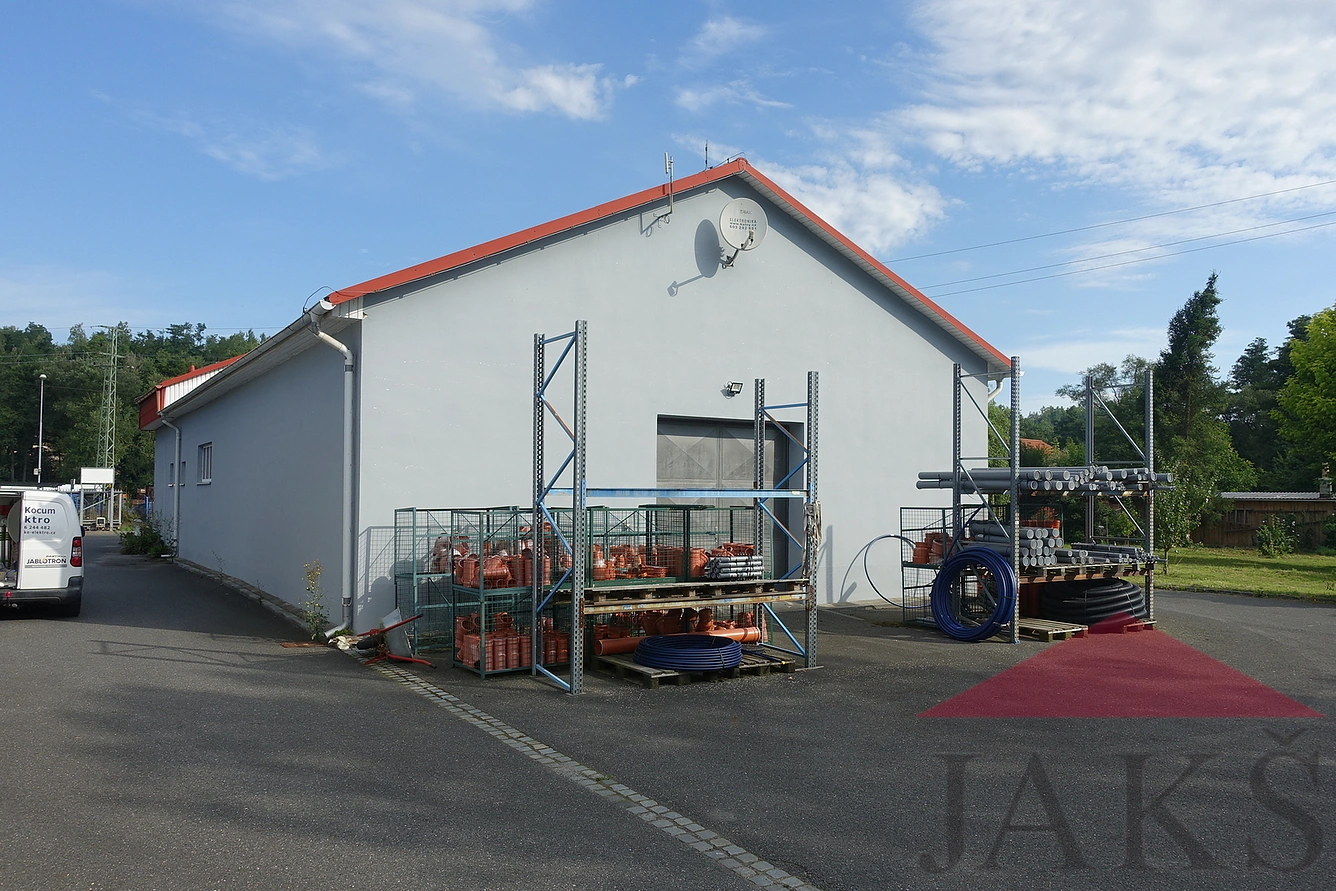 Popis: skladovací hala (dvoje vrata o šířce 2,4 a 2,7 m) o velikosti 182,46 m2 s rozměry 10,2 m x 16,7 m + 2,5 m x 4,2 m a výškou 3,7 m, prodejna či kancelář 35,9 m2, chodba 7,4 m2, sociální zařízení 2,94 m2 (WC, umyvadlo) a denní místnost 6,88 m2 (kuchyňka, sprcha, šatna).
