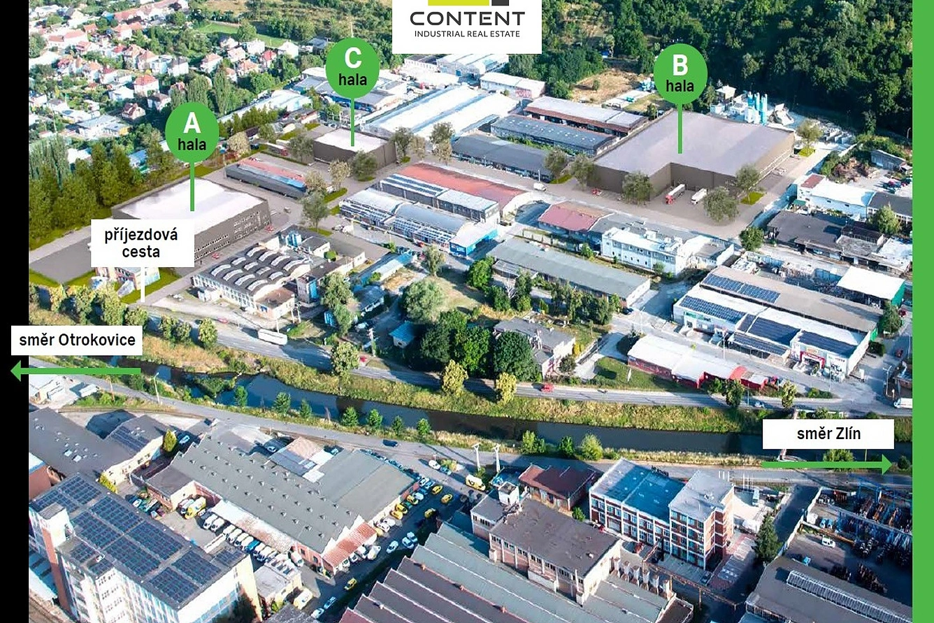 V zastoupení majitele a bez provize nabízíme prostory 980 - 7200 m² vhodné pro sklad nebo výrobu, umístěných v komerčním areálu poblíž centra Zlína s napojením na dálnici D55 (10 km).
