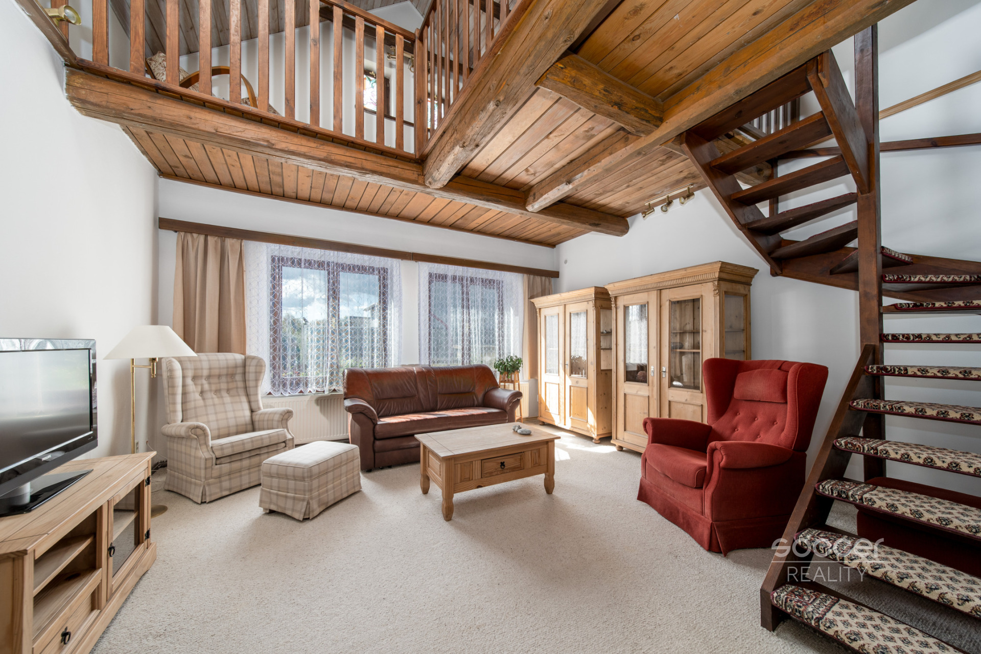 Samotný nenápadný dům vám zajistí mimořádně útulné zázemí a je vybaven stylovým nábytkem, ladícím s duchem místa. Dispozičně je řešen jako 3+kk, plus velká obytná galerie. Najdete zde také vstupní chodbu s masivním schodištěm a dvě koupelny (jednu v přízemí a druhou v podkroví). Pro individuální regulaci vytápění slouží plynový kotel. Na obytnou galerii vede schodiště také přímo z hlavního obytného pokoje s kuchyňským a jídelním koutem. Celkově interiér mile překvapí atypickým řešením a jedinečnou atmosférou.