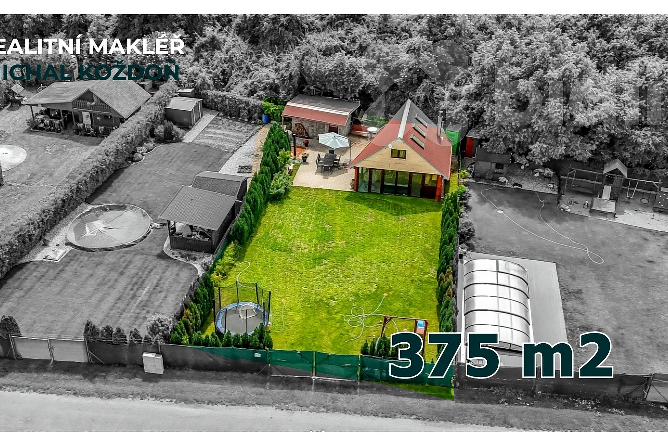 Součástí pozemku je chata o rozměrech 7 × 6 metrů. Stavba je částečně zděná, druhou polovinu tvoří prosklená konstrukce z oken a dveří, která přirozeně propojuje interiér s exteriérem a dodává prostoru dostatek světla. Před chatou se nachází terasa, ideální pro posezení s výhledem do zahrady.