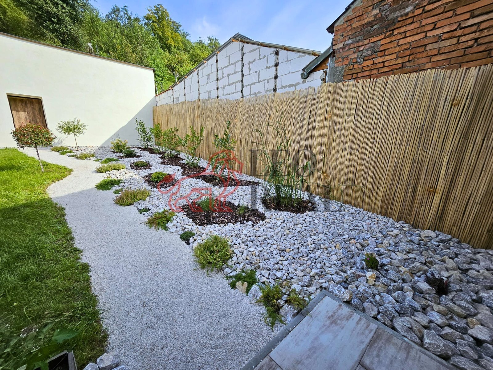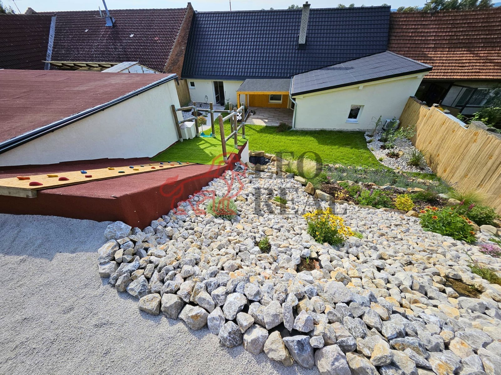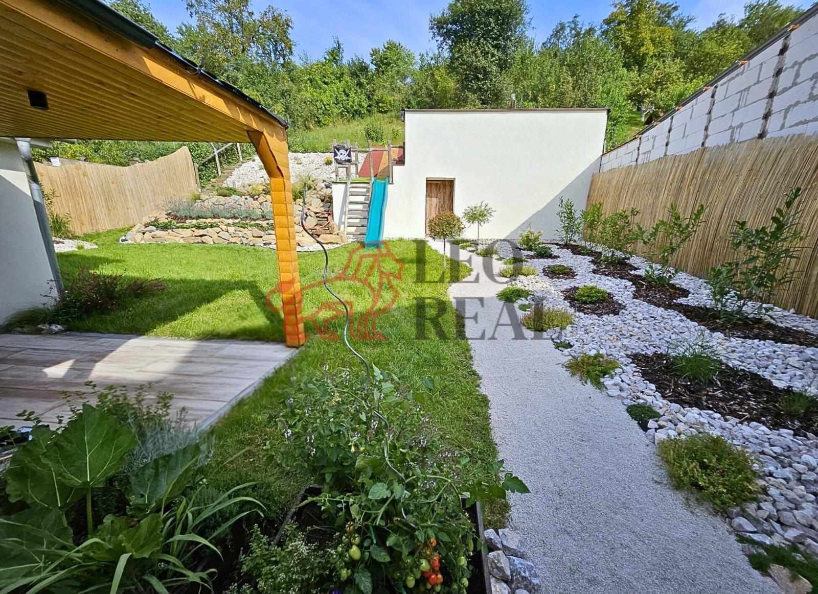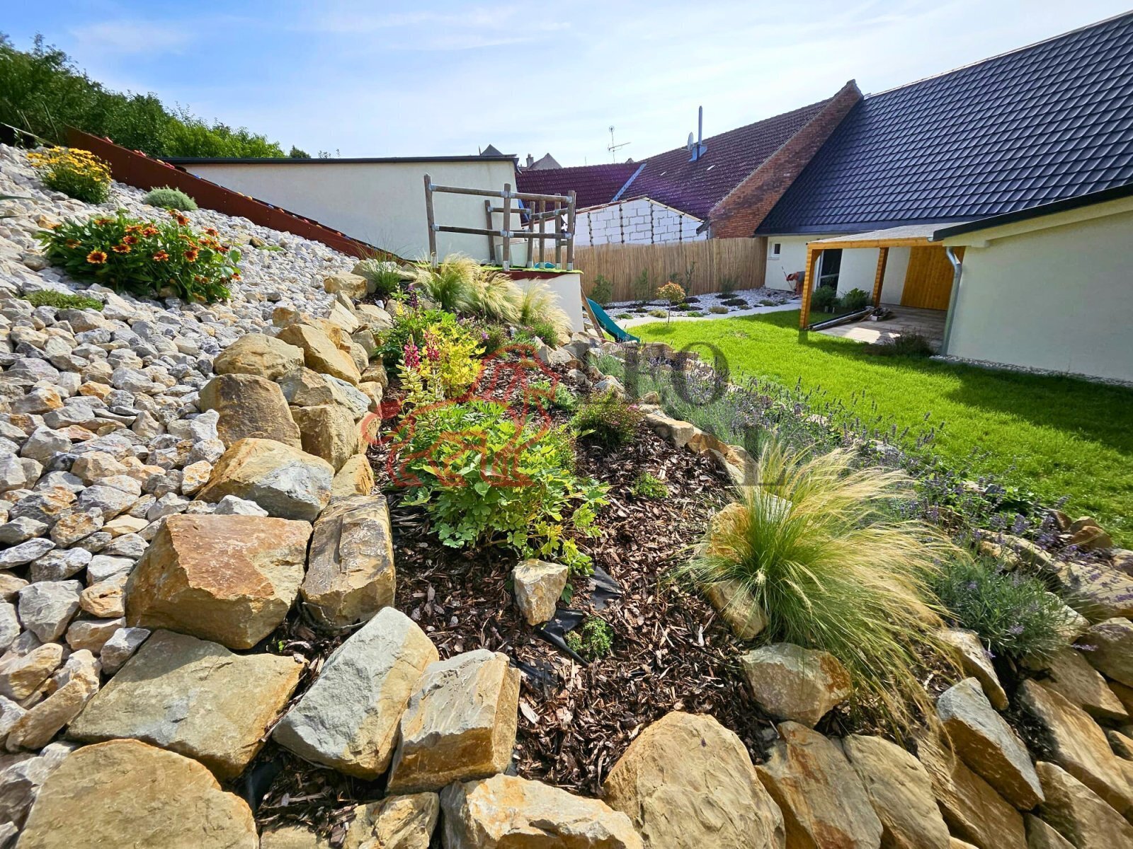 Zahrada (cca 600 m²) je rozdělená na dvě části – rovnou se zastřešenou pergolou a relaxační svahovitou část s výsadbou, ohništěm a výhledem do zeleně.