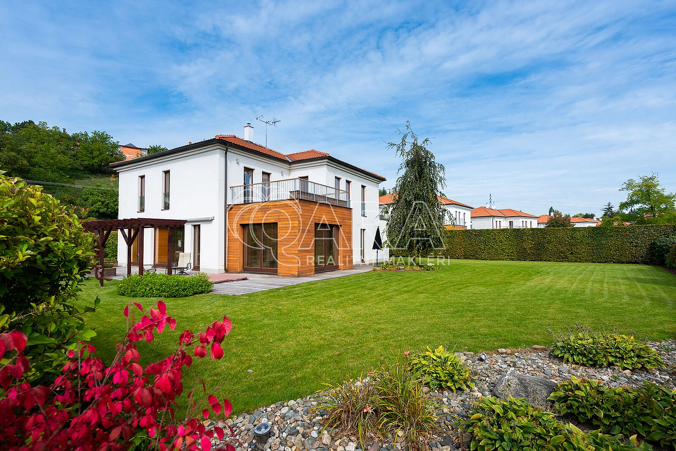 Nabízíme k pronájmu exkluzivní moderní prostornou vilu, která se nachází v jedinečném projektu Statenický Mlýn. Dvoupatrový dům s rozlohou 364 m2, který je charakteristický čistými liniemi a velkými francouzskými okny, nabízí v přízemí velkorysý obývací pokoj s krbem, čítárnu, prostornou jídelnu a kompletně zařízenou kuchyň s vestavěnými spotřebiči se vstupy na zahradu. V 1. patře se nachází hlavní ložnice s koupelnou a šatnou, dva dětské pokoje, velká koupelna s vanou od designéra Philippa Starcka a sprchou, pokoj pro hosty s další koupelnou a šatnou a pracovna. Čtyři ložnice umožňují přístup na terasu.